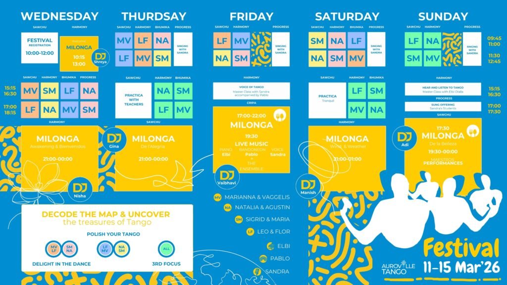 If you need financial assistance to attend the Festival, please apply for Auroville Tango Scholarship.